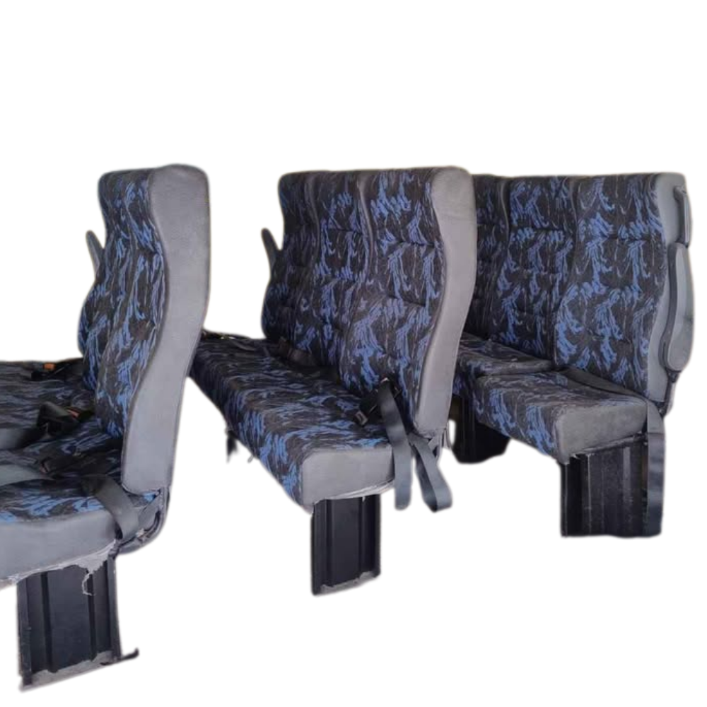🏷️ Aplicação: Vans Renault Master, Fiat Ducato e veículos adaptados | 🔧 Sistema: Assento fixo (não reclinável) | 🎨 Acabamento: Tecido navalhado azul | 🪙 Estrutura: Aço reforçado + espuma de alta densidade | 🔒 Segurança: Cintos de segurança individuais | ⚠️ Condição: Usado